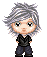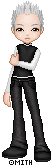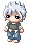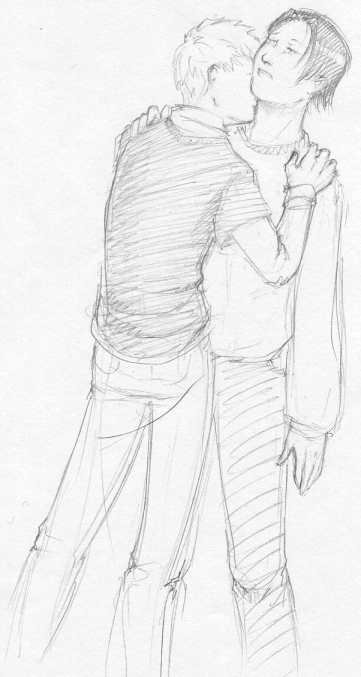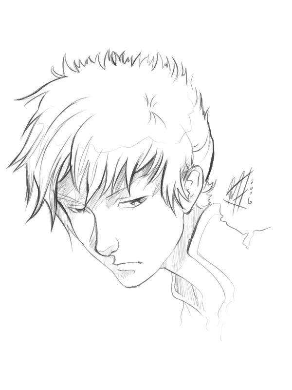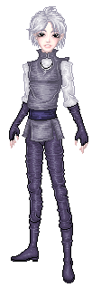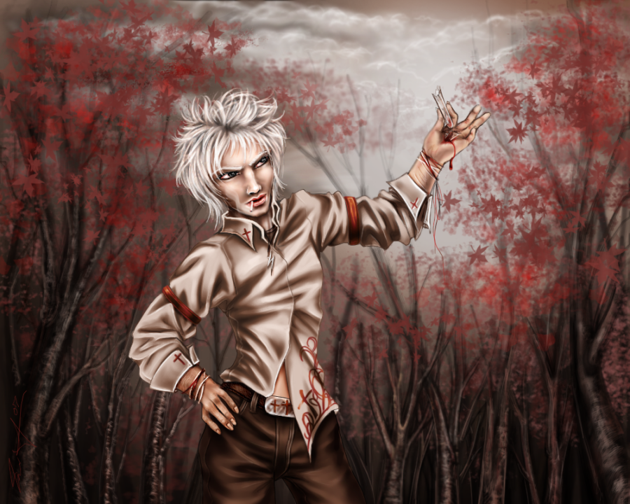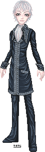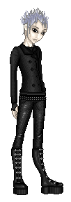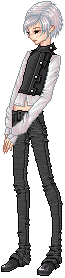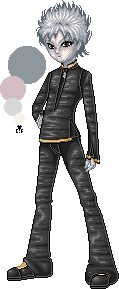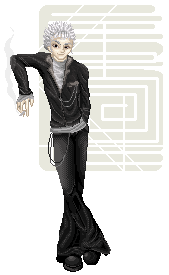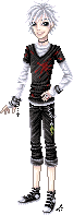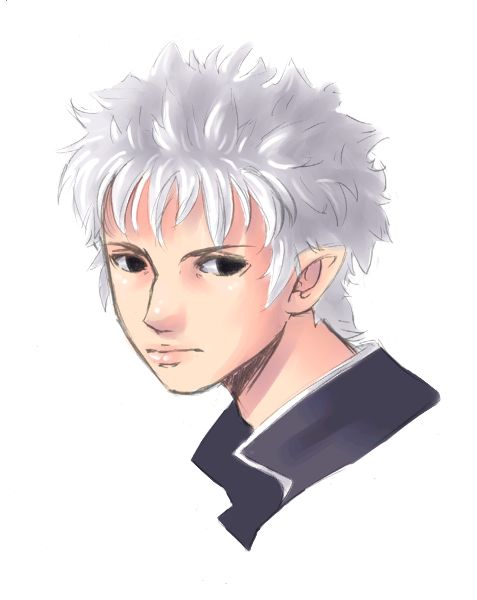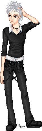 Skin color is very pale, with almond-shaped black eyes - not brown but *black*, like the pupils have dilated up to completely absorb the iris [because this is, in fact, what has happened]. His hair is a snowy white, soft and fluffy, and is usually cut into wild spikes. It varies in length, sometimes cropped closer to his head and sometimes longer, but it never grows past the bottom of his ears. He has a spiderweb of slashing scars up the insides of his arms, from the elbow to the wrist and continuing up his palm to the tips of his fingers.