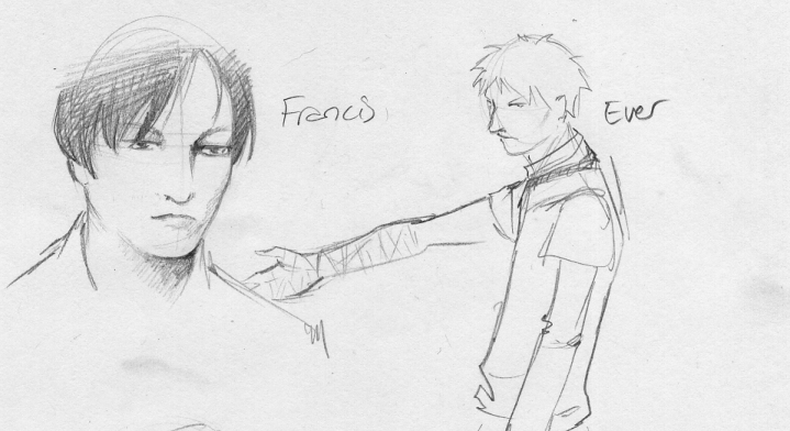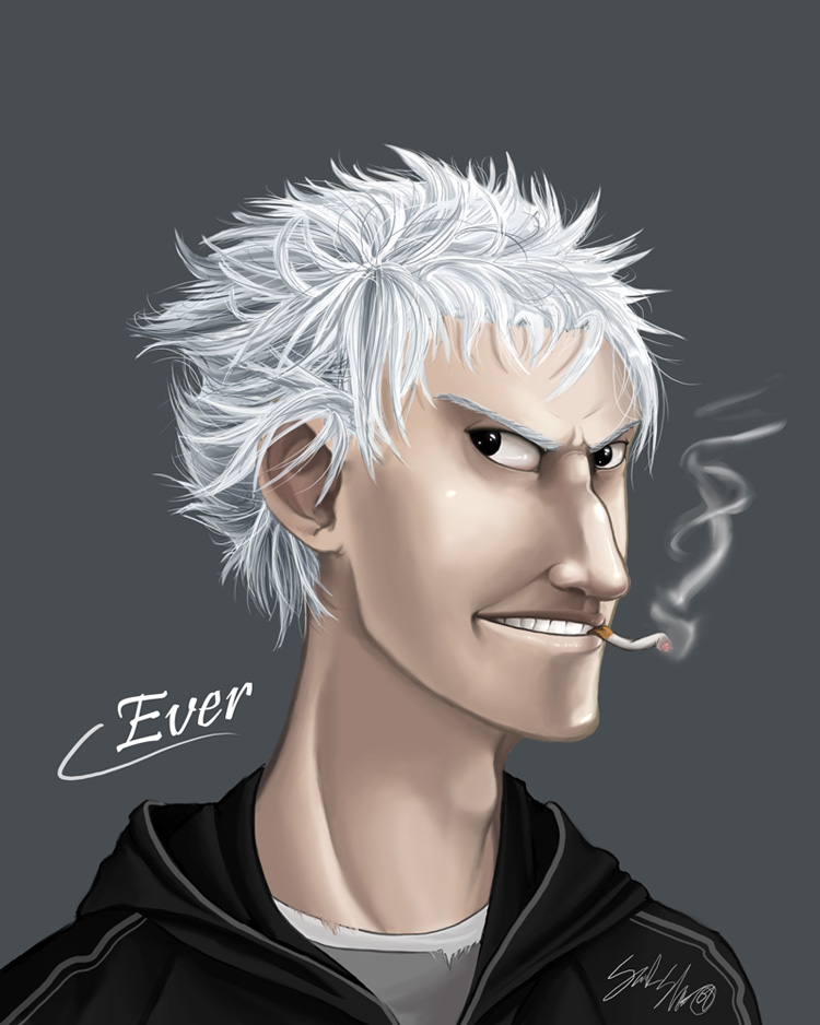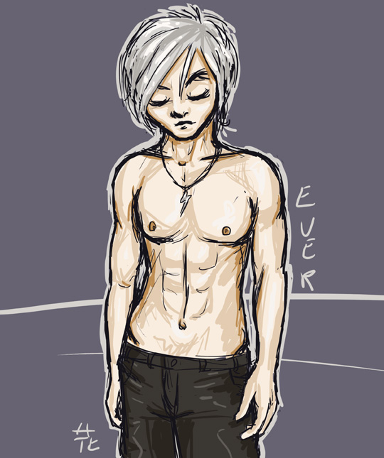 Ever is a 24-year-old vampire who looks more like he's 17. He's 5'11" and weighs around 125 pounds - for the record, this is pretty severely underweight. His features are sharp and hawkish, his nose about a size and a half too large for his face, with a bend in the bridge from where it was broken once and never properly set.