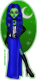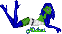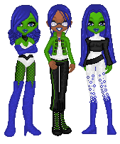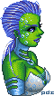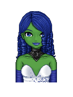So her skin is a midori green; her hair is a bright blue. Her costume colors are blue/white/black...and...that's the basics.